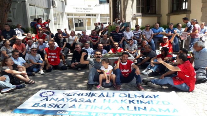 Tüm bu yaşananlardan sonra DİSK yetkilileri ilk olarak Bergama Belediyesi önünde oturma eylemi başlattı. Yapılan basın açıklamasında ise Bergama Belediye Başkanı Hakan Koştu’nun, Türkiye Cumhuriyeti Devleti olarak sözleşmelerine imza atılan İLO ilkelerini ihmal ettiği, Türk Ceza Kanunu’nun 118’inci maddesine göre alenen suç işlediği vurgulandı. İzmir 4 No’lu Şube Başkanı Şükret Sevgener tarafından okunan basın açıklamasında; “Bergama halkı, belediye başkanına Anayasımızca ve imzaladığımız İLO sözleşmeleri prensipleri ile güvenceye alınmış işçilerin en temel hakları olan sendikal haklarını gasp etmek için oy vermemiştir. Bergama belediye işvereni ve belediye bürokratları siyasi iktidarın yandaşı olan sendikaya işçiler baskı, zor, tehdit ve korkuyla üye yaptırmaya çalışmaktadır. Hak-İş’e bağlı Hizmet-İş Sendikası’na belediyede oda verilerek işçilerin iktidar gücüyle sindirilip istifa etmelerini sağlamaya çalışmak olsa olsa baskıcı ve otoriter yöntemlerle sonuç almaya çalışmaktır” denildi.