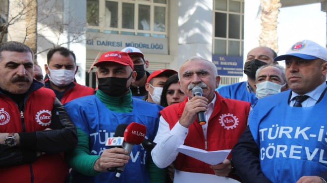Sendikalar adına ortak açıklamayı okuyan DİSK Ege Bölge Temsilcisi Memiş Sarı şunları söyledi: