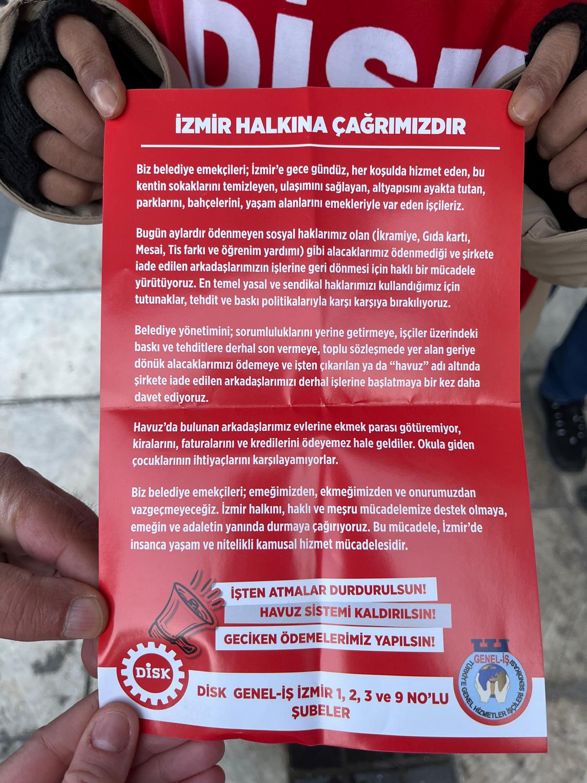 Asena TUNCA/GERÇEKİZMİR - İzmir Büyükşehir Belediyesi iştirakleri İZENERJİ, İZELMAN, İZFAŞ, EGEŞEHİR ve İZTEK işçilerinin, aylardır ödenmeyen haklar, toplu iş sözleşmesi haklarının yatmaması, maaşlarının eksik yatırılması, işten çıkarılanlar, iade edilmelerine rağmen işbaşı yaptırılmayan üyeler ve ücretlere yönelik haksız uygulamaları gerekçe göstererek başlattıkları eylem ikinci haftasına girdi.