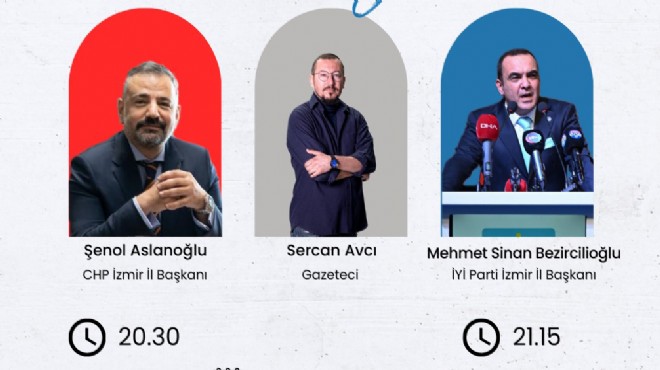 CHP İzmir İl Başkanı Şenol Aslanoğlu saat 20.30, İYİ Parti İl Başkanı Sinan Bezircilioğlu da saat 21.15'ten itibaren sırasıyla konuk olacakları Politika Durağı’nda Sercan Avcı’nın gündeme ilişkin sorularını yanıtlayacak.
