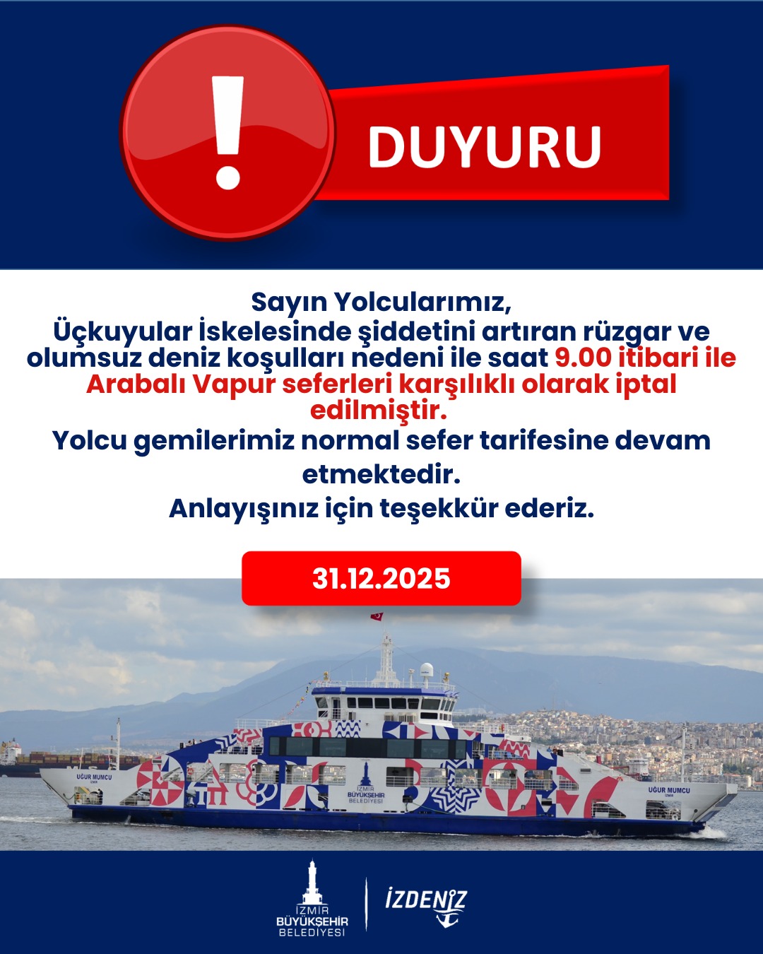 İZDENİZ tarafından yapılan duyuruda, Arabalı Vapur seferlerinin 31 Aralık 2025 Çarşamba günü saat 09.00 itibarıyla geçici olarak durdurulduğu belirtildi. Açıklamada, yolcu gemilerinin ise mevcut sefer tarifesine göre hizmet vermeyi sürdürdüğü ifade edildi.