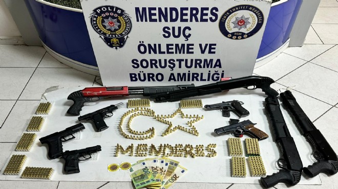 Menderes Suç Önleme ve Soruşturma Büro Amirliği ekipleri, ilçede bir kişinin silah kaçakçılığı yaptığı bilgisini aldı. Bunun üzerine teknik ve fiziki takip başlatan polis, E.Ş.'nin Ordu'dan silah getirdiğini ve sattığını tespit etti. Savcılığın talimatı ile operasyon düzenleyen polis, E.Ş.’yi gözaltına aldı. E.Ş.’nin adresinde yapılan aramada, 3 ruhsatsız tabanca, 2 kurusıkı tabanca, 4 pompalı av tüfeği, 752 tabanca mermisi, 26 tüfek fişeği, 14 kurusıkı tabanca mermisi ve silah ticaretinden elde edildiği değerlendirilen bin 500 avro ile 2 Cumhuriyet altını ele geçirildi. Gözaltına alınan E.Ş. ise Menderes İlçe Emniyet Müdürlüğü'ne götürüldü. E.Ş.'nin işlemleri tamamlandıktan sonra adliyeye sevk edileceği bildirildi. (DHA)