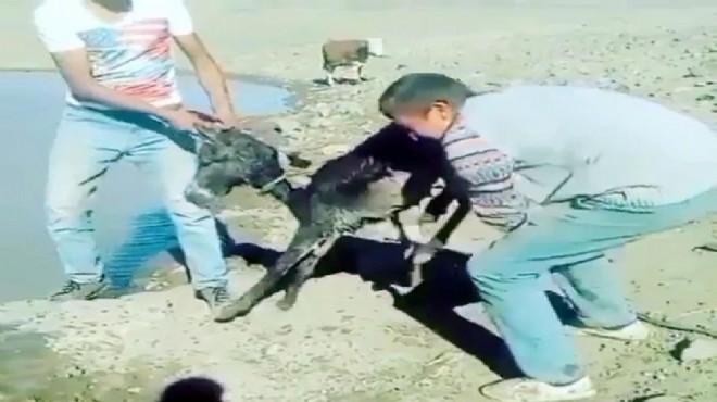 Digor ilçesine bağlı Alem köyünde 2 kişi, boynuna ip bağladıkları sıpayı göle attı. Yavru eşeğe eziyet ederek eğlenen 2 kişi, cep telefonuyla çektikleri görüntüleri de sosyal medya hesaplarından paylaştı.