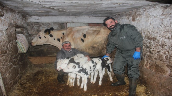 Veteriner Hekim Hüseyin Kemer ise "Doğal yolla kızgınlık göstermeyen Nazlı ismindeki İneğimize Progeston hormonu emdirilmiş İntravaginal araç ile programlı suni tohumlama ile gebe kalması sağlandı. Gebelik takibinin son ayında çoğul gebelik olduğu anlaşılınca inek sahibi Bayram Ali Çakır'a bilgi verip ineği daha özenli bakmasını sağladım. Ben dördüz gebelik değil 2 buzağı bekliyordum. İneklerde 4 gebelik dünyada fazla rastlanır bir durum değil. Buzağılar dünyaya gelir gelmez bakımlarını yapıp destek serumlarını verdik. Şuan gerek Nazlı ineğimiz gerekse buzağılarımızın sağlık durumu gayet iyi" diye konuştu. (DHA)