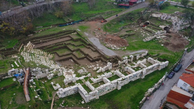 Kemeraltı ile Kadifekale semtleri arasındaki antik kentte sürdürülen kazı çalışmaları sırasında 2 yıl önce keşfedilen tiyatronun batı kısmındaki 3 metre 66 santimetre genişliğinde, 6 metre uzunluğundaki "L" biçimli seyirci geçidi, gün ışığına kavuşturuldu.