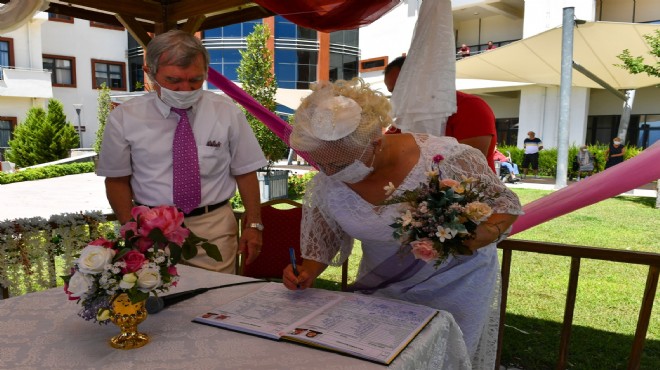 İzmir Büyükşehir Belediyesi’nin Buca’daki Sosyal Yaşam Kampüsü’nde heyecanlı bir gün yaşandı. İki yıl önce Kampüs’te yaşamaya başlayan ve burada tanıştıktan sonra birbirine aşık olan 3 çocuk annesi Ayşe Küpeli (74) ile 5 çocuk babası Cevat Tunçel (72), hayatlarını birleştirme kararı aldı. Çiftin nikah töreni için Kampüs’ün bahçesi hazırlandı. Koronavirüs salgınından dolayı sınırlı sayıda davetli ile yapılan törene katılanlar, maske ve sosyal mesafe kurallarına dikkat etti. Ayşe Küpeli ile Cevat Tunçel’in nikahını Çiğdem Karşıyakalı kılarken, nikah şahitliğini ise Büyükşehir Belediyesi Genel Sekreteri Ertuğrul Tugay ile Sosyal Hizmetler Dairesi Başkanı Ulaş Aydın üstlendi. Evlilik cüzdanını alan Küpeli’nin “Tapuyu aldık” sözleri herkesi güldürdü.