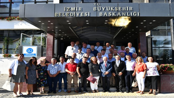 İzmir Büyükşehir Belediye Başkanı Tunç Soyer, Urla Belediye Başkanı Burak Oğuz ve Urla'dan gelen 36 muhtarı ağırladı.