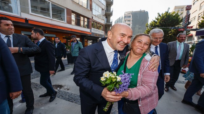 Alsancak’ta yurttaşların yoğun ilgisiyle karşılaşan Başkan Tunç Soyer, 10 yaşındaki İnci Yılmaz’a yeni yıl hediyesi nergis hediye etti.