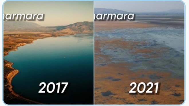 Soyer, Gölmarmara’nın 2017 ve 2021’deki fotoğraflarını, “Günü gelir çarh düzüne çevrilir, günü gelir hesabınız görülür. Günü gelir sualiniz sorulur: Beyler bu vatana nasıl kıydınız?” çıkışıyla paylaştı.