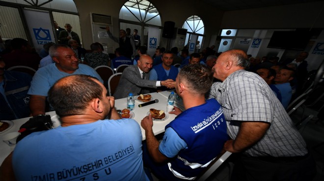 İZSU çalışanlarıyla buluşmasında Başkan Tunç Soyer'e İzmir Büyükşehir Belediyesi Genel Sekreteri Dr. Buğra Gökçe, İZSU Genel Müdürü Fügen Selvitopu, DİSK Ege Bölge Temsilcisi Memiş Sarı, Tüm Yerel-Sen Genel Başkanı Başkanı Hakan Kıran, Genel İş Sendikası 3 Nolu Şube Başkanı Faruk Saral da eşlik etti.