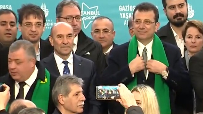 İmamoğlu Gaziosmanpaşa'daki çok amaçlı tesisin açılış töreninde Soyer'i kürsüye, "Değerli dostum, İzmir'de çok başarılı işlere imza atmış ve bugün de bana destek olmaya gelmiş İzmir Büyükşehir Belediye Başkanımız Tunç Soyer burada, alkışlarınızla yanıma almak istiyorum. Tunç Başkanımız benimle İstanbul'da biraz çalışacak. Tabi İzmir'de işleri var, oraya da dönecek. İnşallah İzmir'de kazanmamız için de çalışacak. Hep birlikte bütün büyükşehirlerde iddiamızı ortaya koyacağız. Sonuçta memleketimiz kazanacak. Biz 5 yıl boyunca 11 büyükşehir belediye başkanımızla kader birliği yaptık. Biz birikimlerimizle omuz omuza olmaya devam edeceğiz. Bizim birliğimizi kimse bozamaz, bozamayacak" sözleriyle çağırdı.