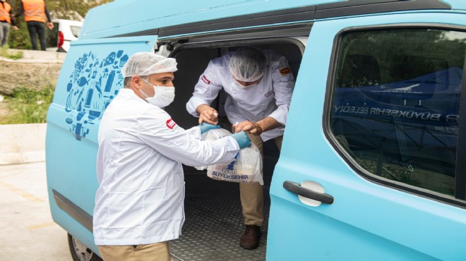 Pandemi nedeniyle toplu yemek organizasyonları yapılamadığı için iftar yemeği paketlerini evlere teslim etmeyi sürdüren İzmir Büyükşehir Belediyesi, ihtiyaç sahiplerinin yüzünü güldürmeyi sürdürüyor. Ramazan ayı boyunca 400 bin kişilik iftar yemeği dağıtmayı hedefleyen Büyükşehir, Bizİzmir dijital platformları ve Halkın Bakkalı web sitesi üzerinden iftar yemeği paketi ve gıda kolisi satın alan İzmirli yurttaşların bağışlarını da evlerin kapılarından teslim ediyor. Dayanışma kampanyası kapsamında bugüne kadar 396 bin liralık iftar yemeği ve gıda paketi satın alındı. İzmirli yurttaşlar 10 bin kişilik iftar yemeği ve iki bin gıda paketi satın alarak dayanışmaya katkı sağladı.