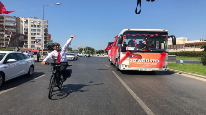 İzmir Büyükşehir Belediye Başkanı Tunç Soyer, 30 Ağustos Zafer Bayramı nedeniyle İzmirlileri bisiklete binerek selamladı. Koronavirüs önlemeleri nedeniyle Valilik tarafından alınan karar çerçevesinde Başkan Tunç Soyer, önceki bayramların aksine Büyükşehir Belediyesi bando takımının yer aldığı üstü açık otobüse binmedi. Başkan Soyer, bu kez kortejin önünde bisikletiyle ilerleyerek Karataş'tan Üçkuyular'a kadar geldi. İnönü Caddesi üzerinden Poligon'a kadar pedal çeviren Soyer, yol boyunca yurttaşları selamladı. Evlerinin balkonlarına çıkan vatandaşlar da el sallayarak Soyer'e sevgi gösterilerinde bulundu. Caddelere çıkan İzmirliler, Başkan Tunç Soyer'e büyük bir coşkuyla karşılık verdi. Bazı yurttaşlar ise o anları cep telefonlarıyla çekim yaparak ölümsüzleştirdi.