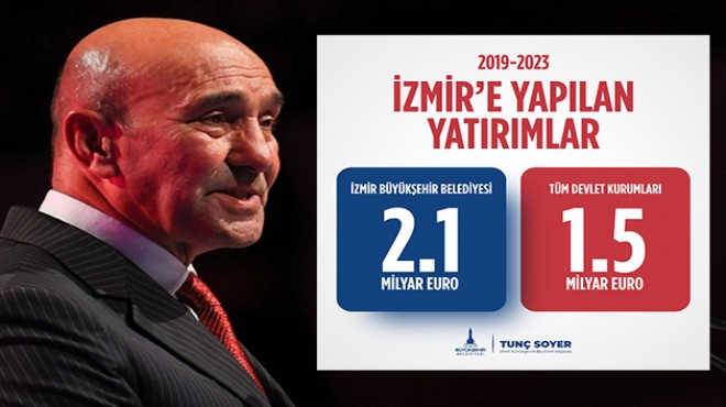 Soyer, 2019 yılından bu güne İzmir’de Büyükşehir Belediyesi’nin 2.1 milyar Euro yatırım kazandırdığını, tüm devlet kurumlarının, bakanlıkların 5 yılda İzmir’e yaptıkları yatırımın 1.5 milyar Euro olduğunu belirtti.