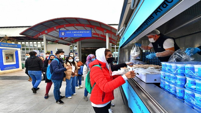 Büyükşehir Belediyesi üniversite öğrencilerine destek olmak için yürüttüğü “Çorba Durağı” hizmetini genişletti. Aşevleri Şube Müdürlüğü öğrencilerin ücretsiz sıcak yemek hizmetinden daha fazla faydalanması için hafta içi her gün 17.00 ile 19.00 saatleri arasında yemek dağıtmaya başladı. Biri Ege Üniversitesi Kampüs içerisindeki metro istasyonu, diğeri ise Dokuz Eylül Üniversitesi (DEÜ) Tınaztape Yerleşkesi karşısındaki Tarık Akan Gençlik Merkezi'nin önünde bulunan iki noktadan öğrencilere zengin bir mönü sunuluyor. Uygulama kısa süre içinde Katip Çelebi Üniversitesi Çiğli Kampüsü’nde de başlayacak.