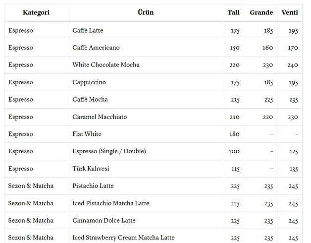 Yeni fiyatlara göre Starbucks'ta Americano'nun fiyatı 120 TL'den 150 TL'ye yükseldi. Filtre kahve ise 115 TL'den 145 TL'ye çıktı. Böylece her iki ürüne gelen zam oranı yüzde 25 ila 30 arasında oldu.