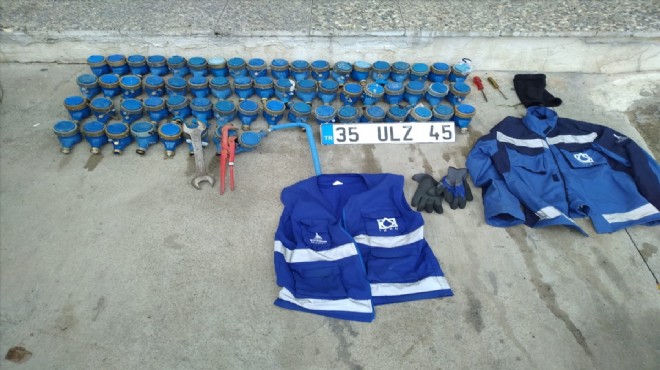 Şüphelinin otomobilinde yapılan aramada 60 civarında su sayacı ve İzmir Büyükşehir Belediyesi İzmir Su ve Kanalizasyon İdaresi (İZSU) yazılı ceket bulundu.