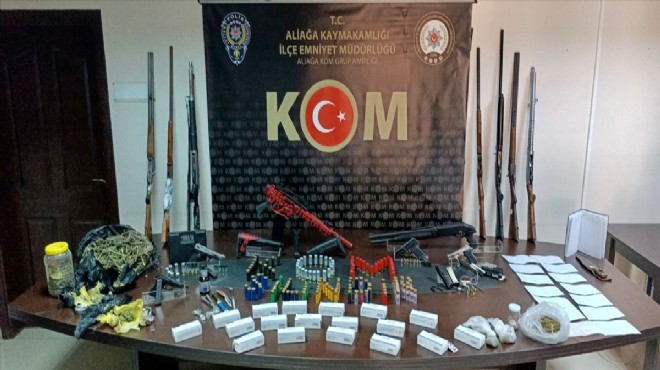 Adreslerdeki aramalarda çok sayıda dinamit lokumu, 39 tabanca, 20 tüfek, 1549 fişek, torna makinesi, 1043 uyuşturucu hap, 612 gram esrar, 14 senet, 7 namlu açma aparatı, 3 silah kabı ve çok sayıda tabanca parçası ele geçirildi.