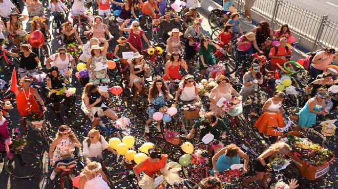 Alaçatı'da gerçekleştirilen Zeynep Erdem'in yaptığı organizasyonuna yaklaşık 50 kadın, süsledikleri bisikletleriyle katıldı. Alaçatı pazaryerindeki balık mezadının yapıldığı alanda toplanan kadınlar, Alaçatı sokaklarından geçerek, Çamlık yoldan Ilıca dört yola kadar gidip, başlangıç noktalarına geri döndü. Kadınlar, güzergah boyunca "Süslüyüz, güzeliz, bisikletliyiz", "Arabadan in, bisiklete bin", "Egzoz kokusuna karşı parfüm kokusu" sloganlarını attı. Bisiklet turuna Çeşme Belediye Başkanı CHP'li Muhittin Dalgıç da, kısa bir süre bisiklet sürerek eşlik etti. Kadınlar, bisiklet turu boyunca yol güvenliklerini sağlamak için görev yapan trafik polisiyle de hatıra fotoğrafı çektirdi. (DHA)