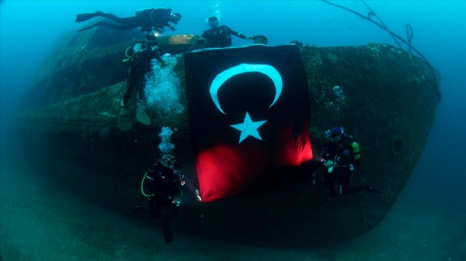 Ege'de su altı güzellikleriyle her yıl binlerce dalış meraklısını ağırlayan Karaburun'da bulunan ve adını kentin kurtuluş gününden alan 9 Eylül Vapuru batığına dalış yapan eğitmenler, yanlarında getirdikleri Türk bayrağını açtı.