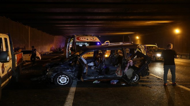 Çarpışmanın şiddetiyle içinde 14 kişinin bulunduğu hafif ticari araç yola savrulurken, diğer otomobil de bariyerlere çarparak durabildi. Otomobilin sürücüsü kazanın ardından olay yerinden kaçtı.