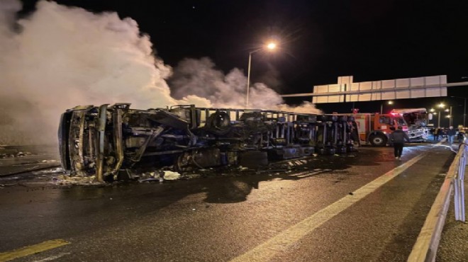 Kazanın ardından savrulan tekstil malzemesi yüklü TIR ile otomobilde yangın çıktı. Tekstil malzemeleri nedeniyle yangın kısa sürede büyürken, her iki araç da alev topuna döndü.
