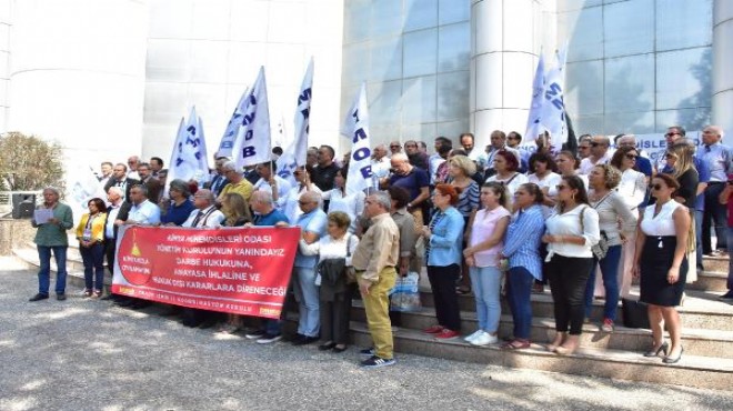 TMMOB İzmir İl Koordinasyon Kurulu, Kimya Mühendisleri Odası yönetim kurulunun mahkeme kararıyla görevden alınmasıyla ilgili basın açıklaması yaptı. İzmir'deki Tepekule Kongre ve Sergi Merkezi önünde bir araya gelen TMMOB'a bağlı meslek odalarının yöneticileri ve üyelerinden oluşan yaklaşık 50 kişilik topluluk, 'Kimya Mühendisleri Odası yönetim kurulumuzun yanındayız. Darbe hukukuna, anayasa ihlaline ve hukuk dışı kararlara direneceğiz' yazılı pankart açtı. Grup adına basın açıklamasını TMMOB İl Koordinasyon Kurulu Dönem Sözcüsü Melih Yalçın okudu.