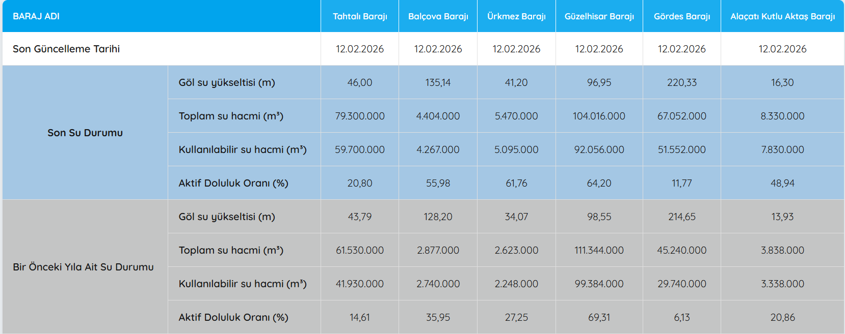 GERÇEKİZMİR - İzmir’de son günlerde etkili olan yağışlar, kentin içme suyu kaynaklarına olumlu yansıdı. 12 Şubat 2026 tarihli verilere göre barajlardaki doluluk oranlarında geçen yılın aynı dönemine kıyasla genel artış yaşandı.