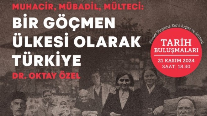 İzmir Büyükşehir Belediyesi’nin Tarih Vakfı iş birliğiyle düzenlediği Tarih Buluşmaları etkinlikleri devam ediyor. Söyleşi programının bu seferki konuğu tarihçi Dr. Oktay Özel olacak. "Muhacir, Mübadil, Mülteci: Bir Göçmen Ülkesi Olarak Türkiye" başlıklı söyleşi, 21 Kasım 2024 Perşembe günü APİKAM’da saat 18.30’da başlayacak.