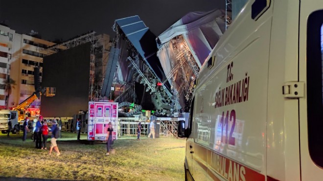 Mega Star için Cumhuriyet Meydanı’nın Kordonboyu tarafında kurulan dev sahne işçilerin çalıştığı sırada henüz bilinmeyen bir nedenle çöktü.