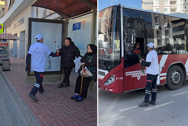 Belediyenin temizlik biriminde çalışan emekçiler, gün içinde hem işlerini yaptı hem de sokaklarda kadınlara çiçek dağıttı.