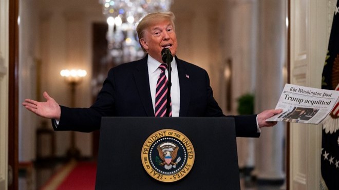 Bir süre önce Beyaz Saray'ın aboneliğini sonlandırdığı Washington Post gazetesinin "Trump aklandı" şeklindeki manşetini salondakilere gösteren Trump, "Washington Post'ta bugüne kadar benim hakkımda atılmış en iyi başlık." dedi.