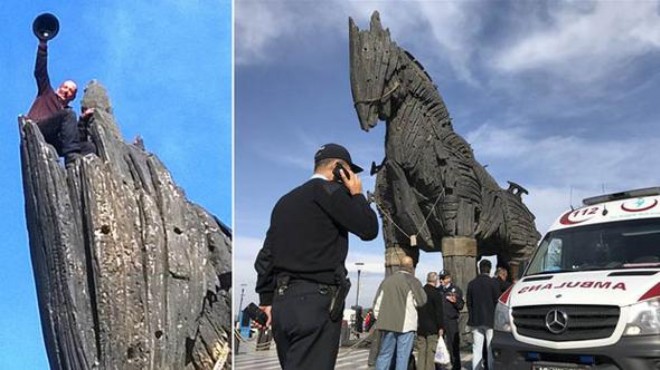 Çevredekilerin şaşkın bakışları arasında Truva Atı’nın baş kısmına kadar tırmanan Güney, burada tehlikeli hareketler yaparak yürekleri ağza getirdi.
