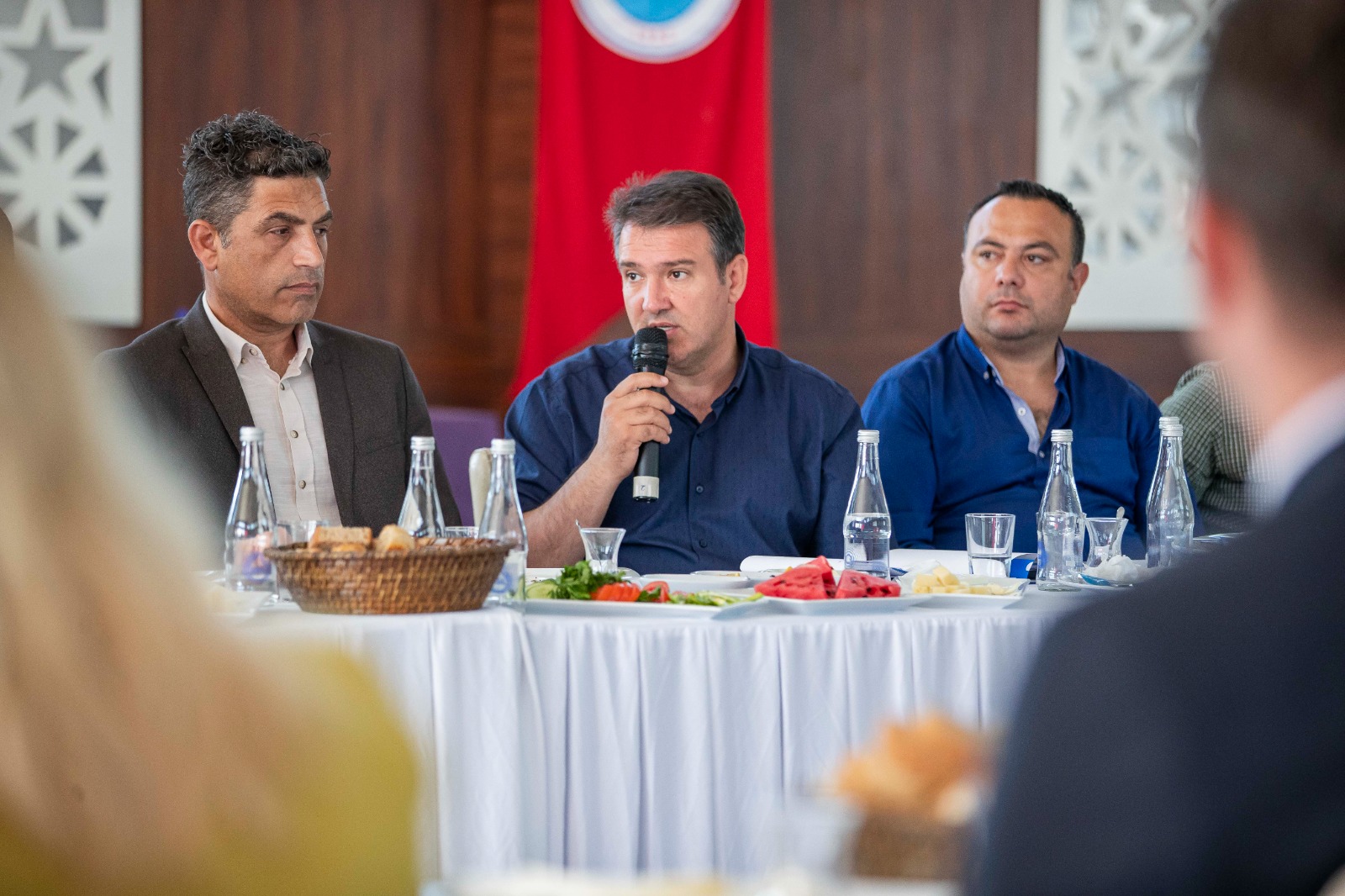 İlçe belediye başkanları ile sık sık görüştüklerini ancak ilçelerin ihtiyaçları ile ilgili daha geniş katılımlı görüşme ve değerlendirme toplantılarını periyodik olarak yapma kararı aldıklarının altını çizen Başkan Tugay, “Büyükşehir Belediyesi ile ilçe belediyeleri tam bir uyum içinde görev yapacak. Birbirinden ayrı belediyeler gibi değil birbirini tamamlayan belediyeler olacak. Bu konuda üzerimize düşen neyse yapacağız. Göreve başladığımız günden bugüne kadar çok iyi bir süreç geçirdik. Bu yakınlığı kurduğumuzu düşünüyorum. Zaman içinde çok daha yakın çalışacağız. Ben ve Büyükşehir Belediyesi’nde görevli olan arkadaşlarımız sizi her konuda dinlemeye, elimizden geleni yapmaya hazırız” dedi.