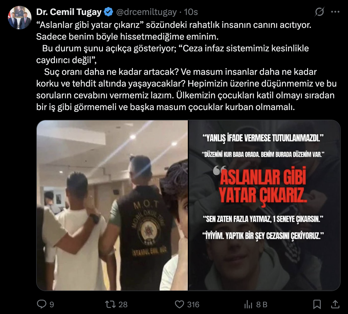 “'Aslanlar gibi yatar çıkarız' sözündeki rahatlık insanın canını acıtıyor. Sadece benim böyle hissetmediğime eminim. Bu durum şunu açıkça gösteriyor; 'Ceza infaz sistemimiz kesinlikle caydırıcı değil.' Suç oranı daha ne kadar artacak? Ve masum insanlar daha ne kadar korku ve tehdit altında yaşayacaklar? Hepimizin üzerine düşünmemiz ve bu soruların cevabını vermemiz lazım. Ülkemizin çocukları katil olmayı sıradan bir iş gibi görmemeli ve başka masum çocuklar kurban olmamalı.'