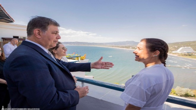 Başkan Tugay, alanda incelemeler yaparak Selçuk Belediye Başkanı Filiz Ceritoğlu Sengel’den konu ile ilgili bilgi aldı. Başkan Tugay, Pamucak sahilini tepeden gören bir noktadan da alanı inceleyerek Sengel ile bölgenin sorunlarını konuştu.