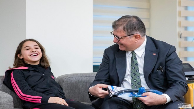 Miray Korkmaz’ın her zaman yanında olacaklarını vurgulayan Başkan Tugay, “Seninle gurur duyuyoruz. Mutlu olman için elimizden ne geliyorsa yapalım isteriz. Bize düşen hangi konu olursa her zaman hazırız” diye konuştu. Başkan Tugay, anne Nihal Korkmaz’a ise “Miray, destek olunmayı fazlasıyla hak eden bir çocuk, özel biri. Biz çok mutlu olarak, gurur duyarak destek olacağız. İnşallah başarılarını göreceğiz” dedi. Ziyarette, Başkan Tugay tarafından Miray Korkmaz’a yüzücü şnorkelinin de içinde bulunduğu hediye paketi verildi.