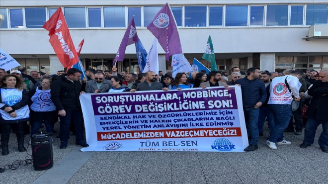 İzmir Su ve Kanalizasyon İdaresi Genel Müdürlüğü önünde bir araya gelen sendika üyeleri, "Soruşturmalara, mobbinge, görev değişikliğine son" yazılı pankartı açtı ve çeşitli sloganlar attı.