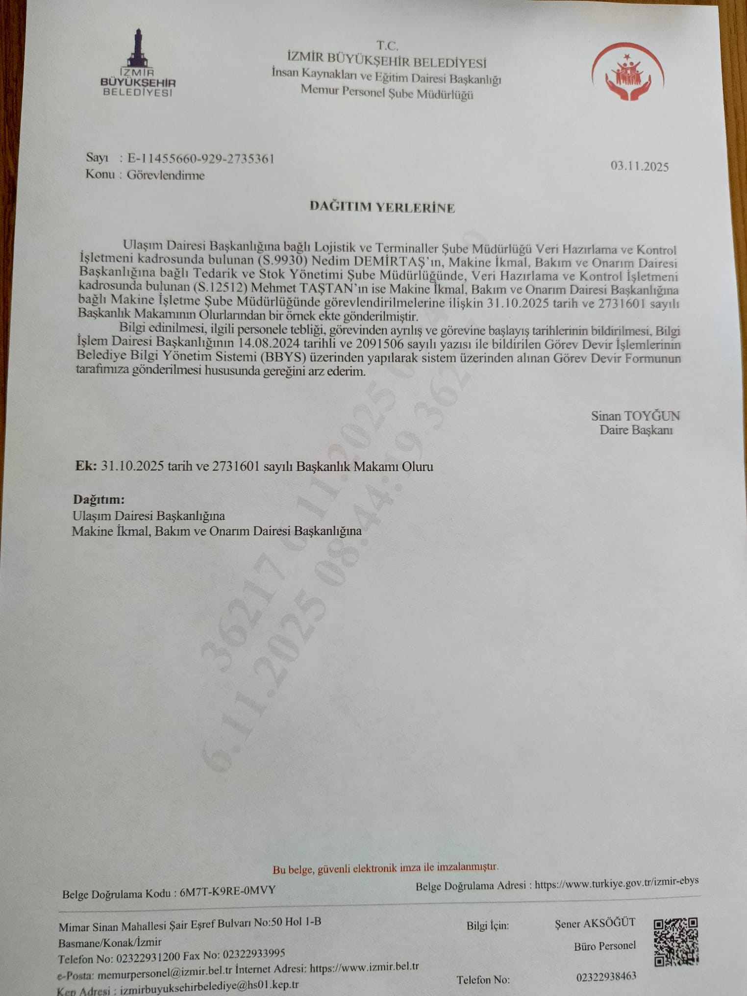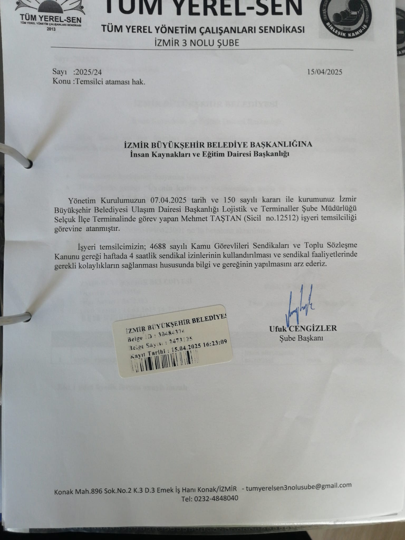 Öte yandan, sendikamızın işyeri temsilcisinin hiçbir hizmet gerekçesi bulunmaksızın ve kendi talebi olmaksızın Selçuk’tan Gaziemir’e görevlendirilmesi, açık bir keyfilik örneğidir. Üstelik bu görevlendirmenin, İzmir Büyükşehir Belediye Başkanı Cemil Tugay’ın talimatı doğrultusunda yapıldığı bilgisi sendikamıza ulaşmıştır. Bu durum yalnızca bir idari tasarruf değil, sendikal haklara doğrudan müdahale anlamına gelmektedir.