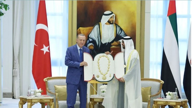 Al Nahyan, görüşme sonrası Cumhurbaşkanı Erdoğan'a "Zayed Devlet Nişanı" tevdi etti.