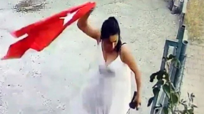 Kadın, kopardığı bayrağı çöp kutusuna attıktan sonra uzaklaştı.
