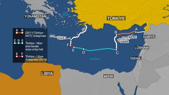 Türkiye ile Libya arasında imzalanan anlaşmaya göre Akdeniz'de 18.6 millik (29.9 km) bir sınır çizgisiyle iki ülkenin kıta sahanlığı (KS) ve münhasır ekonomik bölge (MEB) sınırları belirlenmişti. (AA)