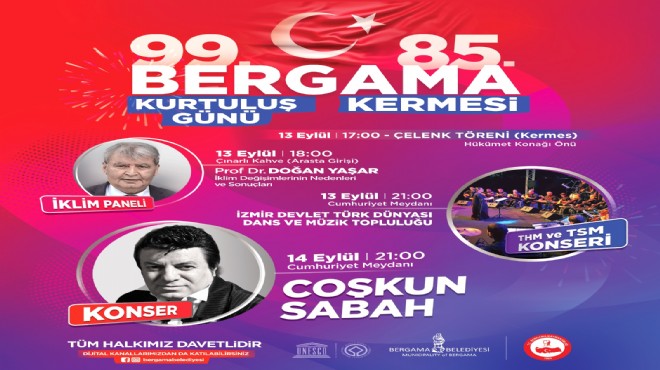 Bergama için ayrı bir yeri olan Kermes için hazırlıkların tamamlandığını ve programa son şeklinin verildiğini belirten Belediye Başkanı Hakan Koştu, “Kermesimizi 13-14 Eylül 2021 tarihlerinde yapacağız. 13 Eylül 2021 Pazartesi günü saat 17.00’de Hükümet Konağı önünde Atatürk Anıtı’na çelenk sunumu ile başlatacağımız kermesimizde aynı gün saat 18.00’de Arasta girişi Çınarlı Kahve önünde İklim değişikliklerini konu alan paneli, daha sonra Cumhuriyet Meydanı’nda saat 21.00’de THM ve TSM Konserini yapacağız. 14 Eylül 2021 Salı günü ilçemizin düşman işgalinden kurtuluşunun 99.’ncu yıl dönümü ile birlikte kermesimizin 2. günü etkinliklerine de devam edeceğiz. 14 Eylül 2021 Salı günü saat 10.00’da Bergama’mızın Düşman İşgalinden Kurtuluşu Günü etkinliklerine Hükümet Konağı önünde Atatürk Anıtı’na çelenk sunumu ile başlayıp, saat 10.30’da Cumhuriyet Meydanı’nda kutlama programımızı, saat 21.00’de ise yine Cumhuriyet Meydanı’nda Coşkun Sabah Konserini gerçekleştireceğiz. Koronavirüs nedeniyle sınırlı katılım olacağından etkinliklerimizi sosyal medya ve tv ekranlarıyla vatandaşlarımızın evine geçen yıl olduğu gibi bu yılda götüreceğiz” dedi.