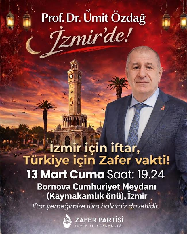Zafer Partisi İzmir İl Başkanlığı tarafından yapılan açıklamada, "Bu anlamlı günde, iftar soframızda birlik ve dayanışmayı paylaşmak üzere tüm vatandaşlarımızı davet ediyoruz.