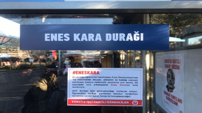İzmir’de Türkiye İşçi Partili üniversite öğrencileri geçtiğimiz günlerde ailesinin ve kaldığı cemaat yurdunda gördüğü baskılar sonucu yaşamına son veren Tıp Fakültesi öğrencisi Enes Kara’nın ismini bir durağa verdi. Durağın önünde yapılan açıklamada, “Enes’in katili onu cemaat ve tarikatların insafına bırakan, öğrencilerin en temel hakkı olan barınma ihtiyacını bile karşılayamayan saray düzenidir. Bu düzene mecbur değiliz. Arkadaşlarımızın her geçen gün işsizlik, yoksulluk, geleceksizlik nedeniyle yaşamına son vermesine artık tahammülümüz kalmadı. Arkadaşlarımızı TÜGVA, Ensar ve buna benzer tarikat yurtlarına mahkum bırakanların karşısında aydınlık bir ülkeyi kuracağız” ifadeleri kullanıldı.
