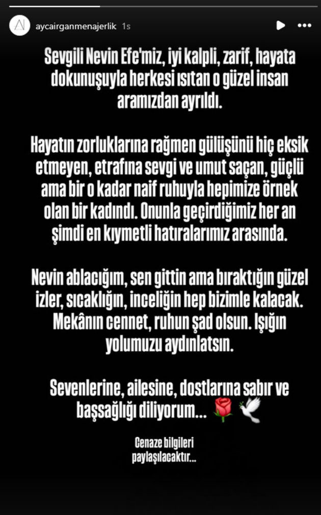 Son olarak 'Yankı' dizisinde rol alan usta oyuncunun vefat haberini, menajeri Ayça Irgan duyurdu. Irgan; "Sevgili Nevin Efe’miz, iyi kalpli, zarif, hayata dokunuşuyla herkesi ısıtan o güzel insan aramızdan ayrıldı. Hayatın zorluklarına rağmen gülüşünü hiç eksik etmeyen, etrafına sevgi ve umut saçan, güçlü ama bir o kadar naif ruhuyla hepimize örnek olan bir kadındı. Onunla geçirdiğimiz her an, şimdi en kıymetli hatıralarımız arasında. Nevin ablacığım, sen gittin ama bıraktığın güzel izler, sıcaklığın, inceliğin hep bizimle kalacak. Mekânın cennet, ruhun şad olsun. Işığın yolumuzu aydınlatsın. Sevenlerine, ailesine, dostlarına sabır ve başsağlığı diliyorum" dedi.