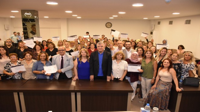 Narlıdere Belediyesi’nin girişimleri ile kurulan Narlıdere Üretici Kadın Kooperatifi’nin ücretsiz eğitimlerine katılan kursiyerler, sertifika sevinci yaşadı. Kadınlara katılım belgelerini takdim eden Başkan Ali Engin “Kadınlarımızı hem üretime dahil ediyor hem de aile ekonomilerine katkı sağlıyoruz. Kursları başarı ile bitiren tüm kardeşlerimi kutluyorum” dedi.