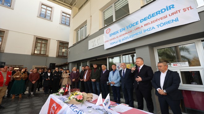Sözleşme töreninde konuşan DİSK 4 No’lu Şube Başkanı Aydın Tekin de yaklaşık 4 ay önce başladıkları Toplu Sözleşme görüşmelerinde, Belediye Başkanının Toplu Sözleşme masasına gelmesiyle birlikte üyelerin onayıyla anlaşmaya varıldığını belirterek, “Urla'nın sokaklarını temizleyen, çehresini güzelleştiren, yeşillendiren, yollarını imal ve tamir eden, güler yüzle doğumdan ölüme Urla halkına hizmet eden değerli yol arkadaşlarıma, şube yönetim kuruluma, işyeri temsilcilerime, Belediye başkan yardımcılarıma, meclis üyelerime, şirket müdürüme, Türkiye ve Urla’da en yüksek oyu alan “Mutlu Çalışan, Mutlu İşçi, Mutlu Urla” diyen, Belediye Başkanım Selçuk Balkan’a teşekkür ederim. Sözleşmemizin Urla halkına, Urla Belediyesi emekçileri ve ailelerine hayırlı olmasını dilerim” dedi.