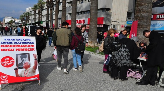 VP Genel Başkanı Doğu Perinçek'in Cumhurbaşkanı adayı olması için İzmir'in 30 ilçesinde imza kampanyası başlan partililer, kentin dört bir yanına kurdukları imza stantları ile vatandaşlardan destek istedi. Vatan Partisi Konak İlçe Sekreteri Özgür Doğu Saymaz, Türkiye genelinde başlatılan kampanya ile haziran ayına kadar 200 bin imza toplamayı hedeflediklerini açıkladı. Saymaz, "Bizim buradaki en önemli amacımız, seçimlere vatan savaşına liderlik edebilecek bir cumhurbaşkanı adayı ile gitmek. Bunun da önderliğini Doğu Perinçek yapıyor. Bu nedenle Perinçek'i aday gösterdik" dedi. Saat 12.00 ile 17.00 arasında açılan stantlarda toplanan imzalar, daha sonra YSK'ya verilecek.