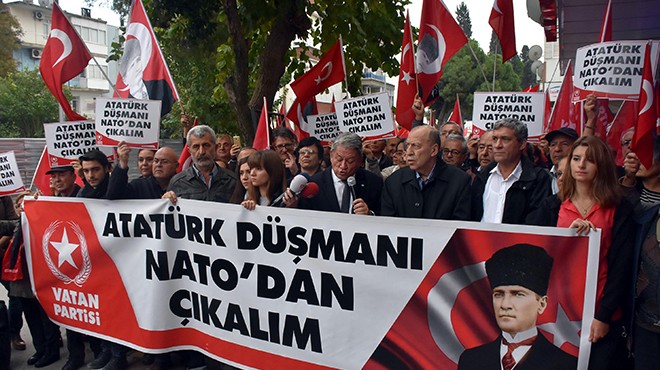 İZMİR - NATO'nun Norveç'te düzenlenen 'Üç Uçlu Mızrak' isimli müşterek tatbikatında Atatürk ve Cumhurbaşkanı Recep Tayyip Erdoğan'ın düşman tarafta gösterilmesine Vatan Partisi İzmir İl yönetimi ile partililer basın açıklamasıyla tepki gösterdi. Buca girişinde toplanan partililer, ardından, biraz ileride bulunan NATO Müttefik Kara Komutanlığı önüne kadar yürüdü. Polis geniş güvenlik önlemi alırken, partililer adına basın açıklamasını Vatan Partisi İzmir İl Başkanı Rıfat Mutlu yaptı.